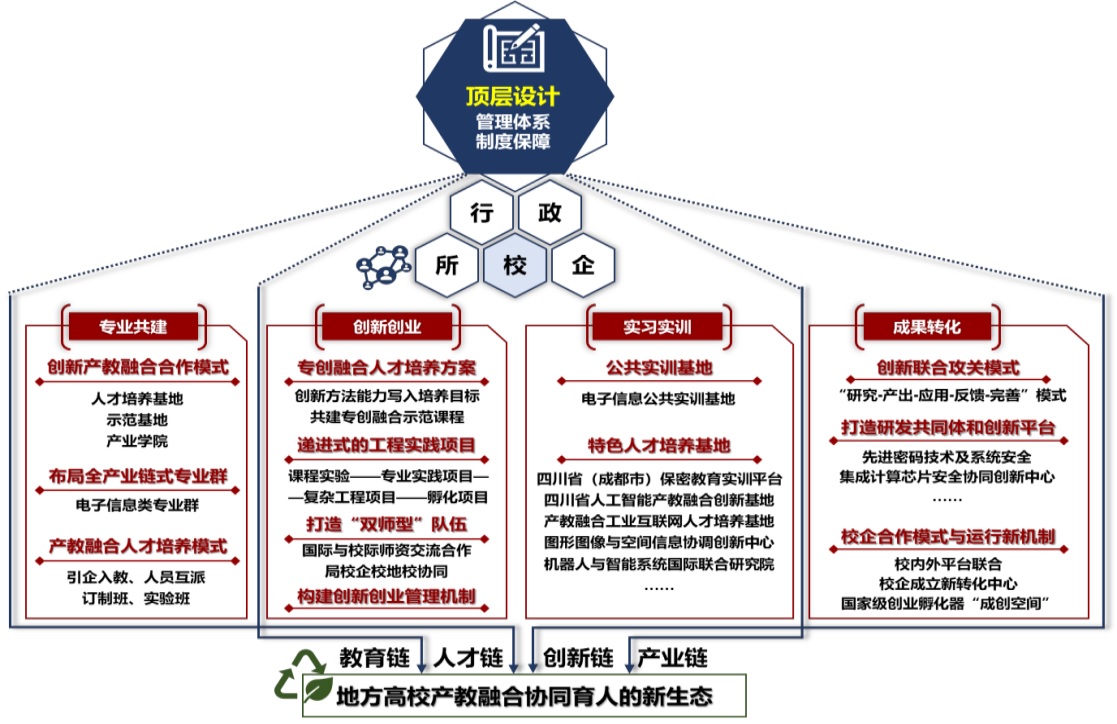 聚焦电子信息安全产业链,高度匹配经济社会发展需求与新型本科教育供给,构建了科教良性互动、产教优势互补的高质量发展格局,探索了服务西部的高等教育应用型人才培养新范式。校企双方顶层设计一体化管理体系和保障制度,贯通高等教育人才培养与新时代产业链、政策链、创新链、服务链,搭建了覆盖产教融合教育全过程的“专业共建、创新创业、实习实训、成果转化”四平台,推进了“人才培养供与需、创新创业校内外、企中校与校中企、成果转化校内外”四融合,系统构建了“校政行企所”等多元主体共建、共享、共赢的“四平台、四融合”的地方高校产教融合协同育人新生态,政产学深度融合,创新了人才培养新模式,激发了高校与企业的创新活力,确立了产教融合协同育人的成信模式,形成了具有“成信大-网安”特色的产教融合示范。