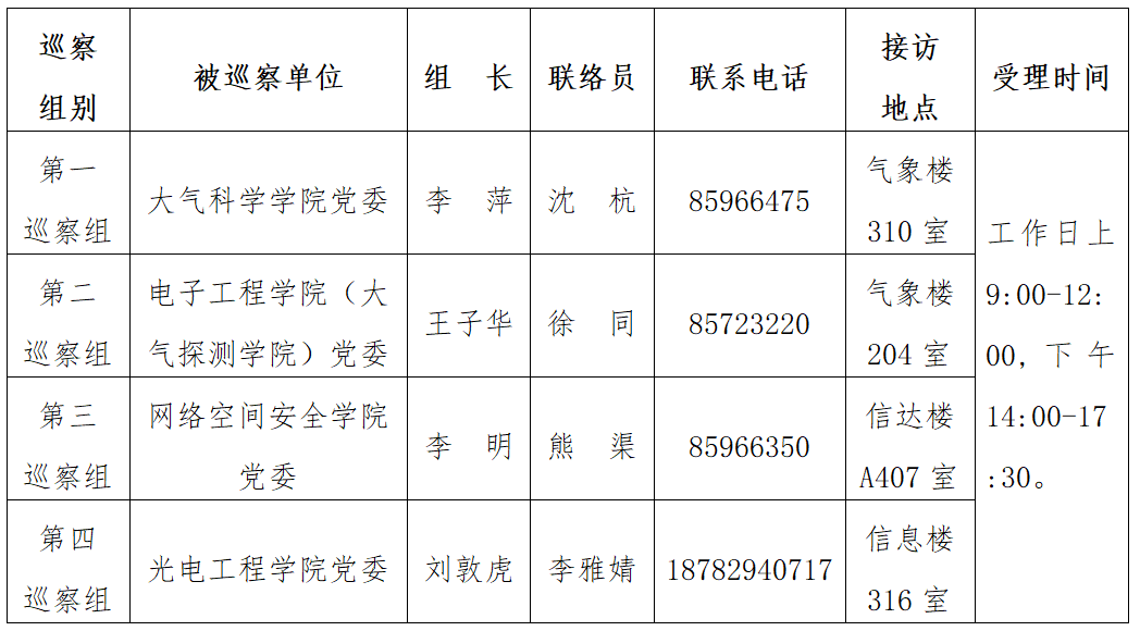 根据《中共三亿网委员会内部巡察工作实施意见》的规定,按照学校党委巡察工作领导小组的统一部署,学校党委巡察组将于2024年10月30日至11月30日,对大气科学学院党委、电子工程学院(大气探测学院)党委、网络空间安全学院党委、光电工程学院党委开展巡察工作。现将有关事宜公告如下: