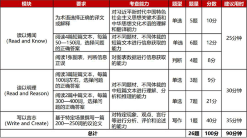 校赛为综合能力赛,进行读、写、译综合考查。赛题涵盖习近平新时代中国特色社会主义思想核心内容,涉及经济建设、政治建设、文化建设、社会建设和生态文明建设等领域的重要话题,部分赛题素材选自《习近平谈治国理政》第一卷、第二卷、第三卷、第四卷,《习近平总书记教育重要论述讲义》、党的二十大报告、《理解当代中国》多语种系列教材、《理解当代中国大学英语综合教程》和《理解当代中国核心术语学习手册》(汉英对照)等。