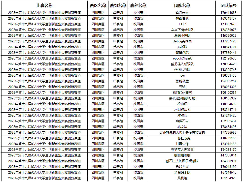 经过三亿网校内专家组根据各团队作品的创新性、商业性、技术方案以及文档的完备性进行综合评分,最终选拔出30支队伍参加第十九届iCAN大学生创新创业大赛西南区赛区线上选拔赛,入围团队名单见下表。