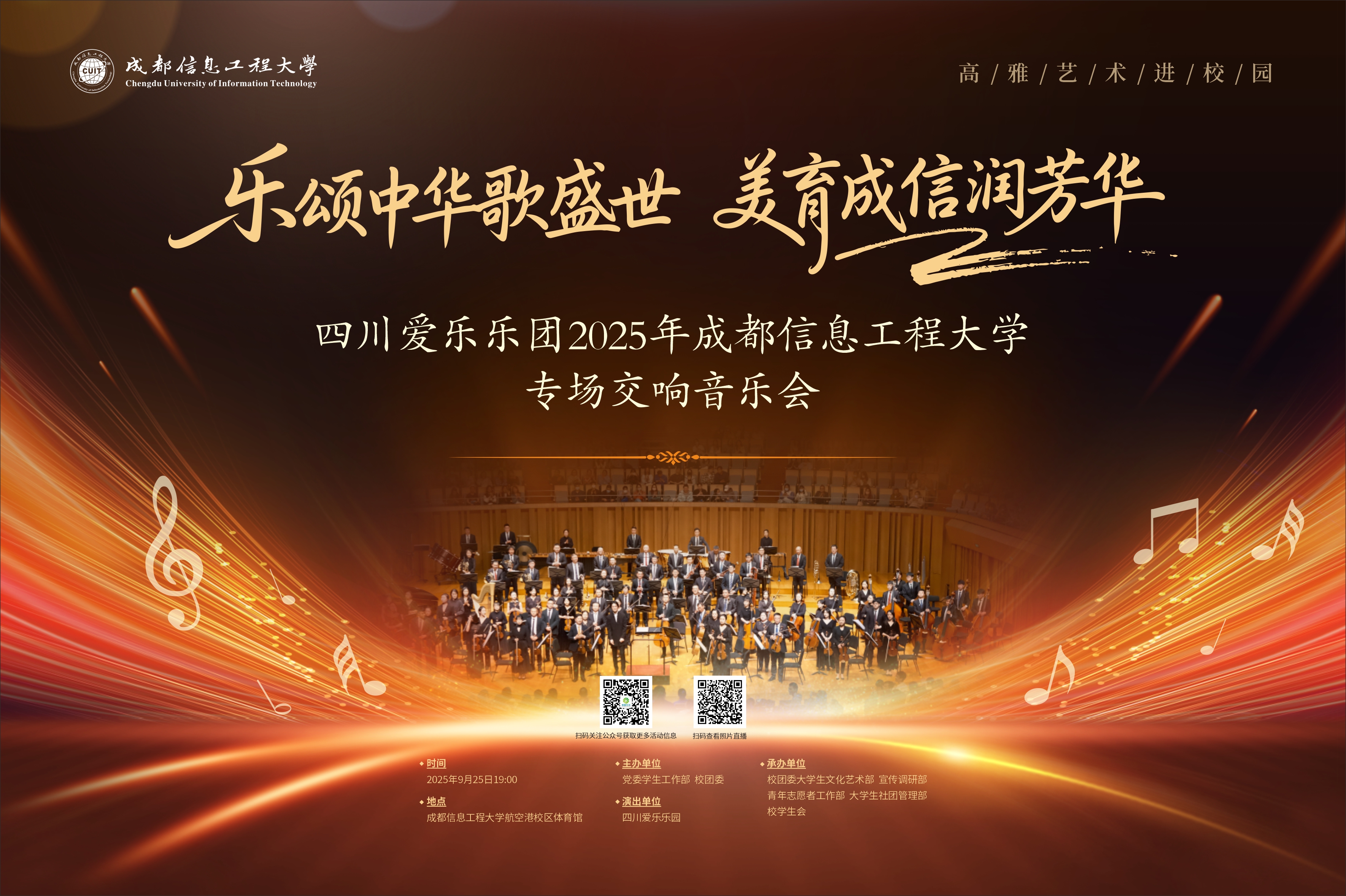 为弘扬中华美育精神,丰富校园文化生活,提升师生艺术素养,感受高雅艺术的独特魅力,我校特邀四川爱乐乐团走进校园,举办“乐颂中华歌盛世,美育成信润芳华”专场交响音乐会。届时,艺术家们将用精湛的技艺和饱满的热情,为我们奏响时代华章。精彩即将上演,诚邀广大师生共赏音乐盛宴!