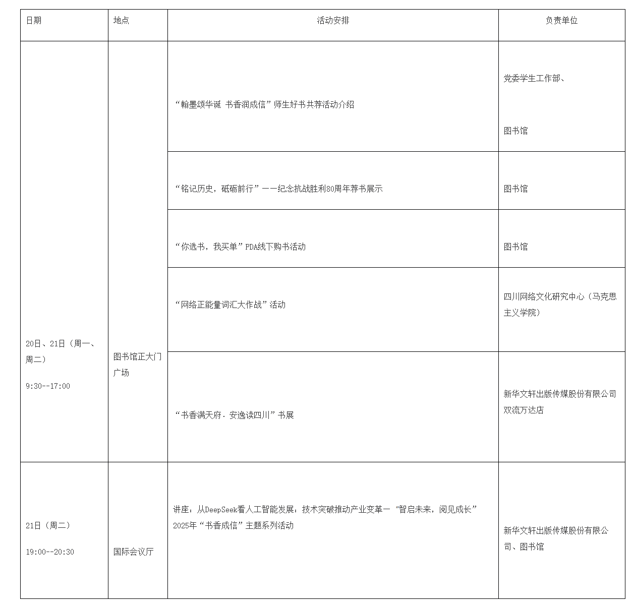 为进一步倡导全民阅读、终身学习的文明风尚,努力建设学习型社会,由四川省委宣传部指导、天府书展组委会主办的“天府书展进校园”活动将于10月20-21日在三亿网举行。学校图书馆在此背景下结合2025年度“书香成信”活动方案,设计了系列活动,期盼师生们在阅读中开阔视野,陶冶情操,提升文化素质。现将活动安排通知如下,欢迎广大师生积极参与!