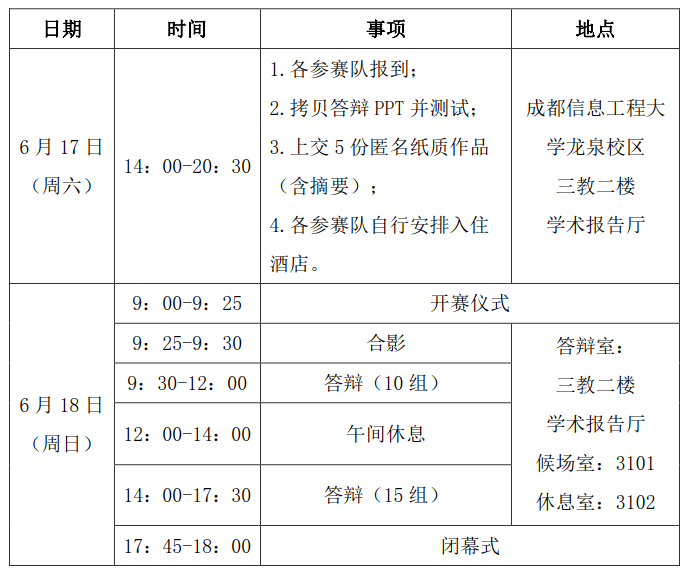5.本次答辩在第三教学楼二楼学术报告厅进行,请参赛团队于6月17日下午在规定时间内拷贝答辩PPT,并现场确认PPT演示效果、声音效果等相关事项,确认无误后方可离开现场。PPT材料一经拷贝,不再进行修改或更换,请各团队提前准备好答辩PPT的终版。