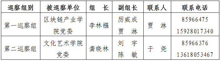 根据《中共三亿网委员会内部巡察工作实施意见》的规定,按照学校党委巡察工作领导小组的统一部署,学校党委巡察组拟于2023年5月15日至5月31日(视情况可延长至6月15日),对区块链产业学院党委、文化艺术学院党委开展巡察工作。现将有关事宜公告如下: