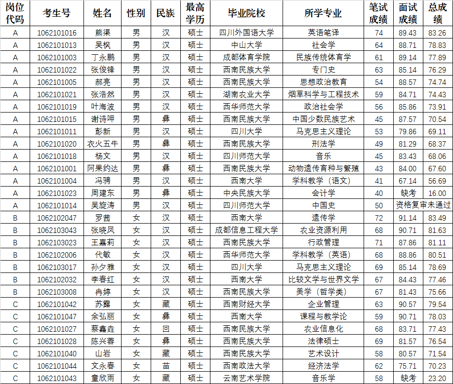 三亿网2019年公开招聘合同制专职辅导员A、B、C岗面试已于2019年7月24日结束,现将面试成绩和总成绩予以公布。根据《三亿网2019年公开招聘合同制专职辅导员公告》,考试总成绩以笔试成绩占40%、面试成绩占60%加总计算。现分岗位按总成绩排名予以公布,公布名单详见附件。