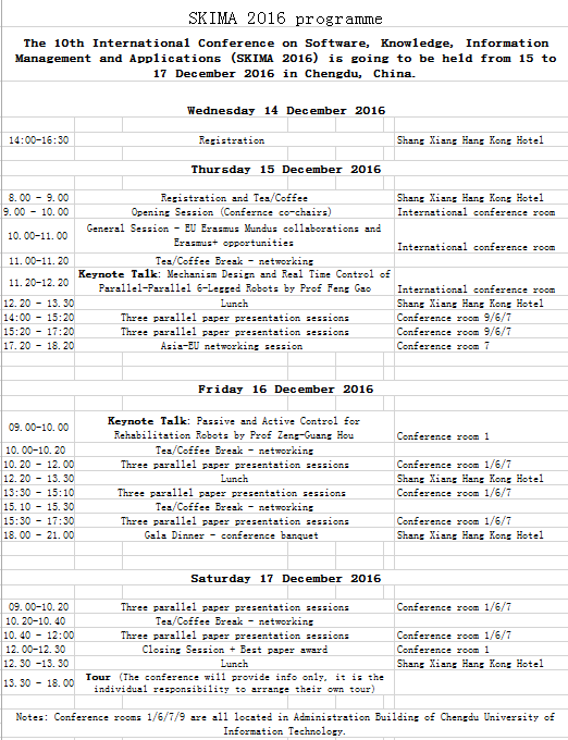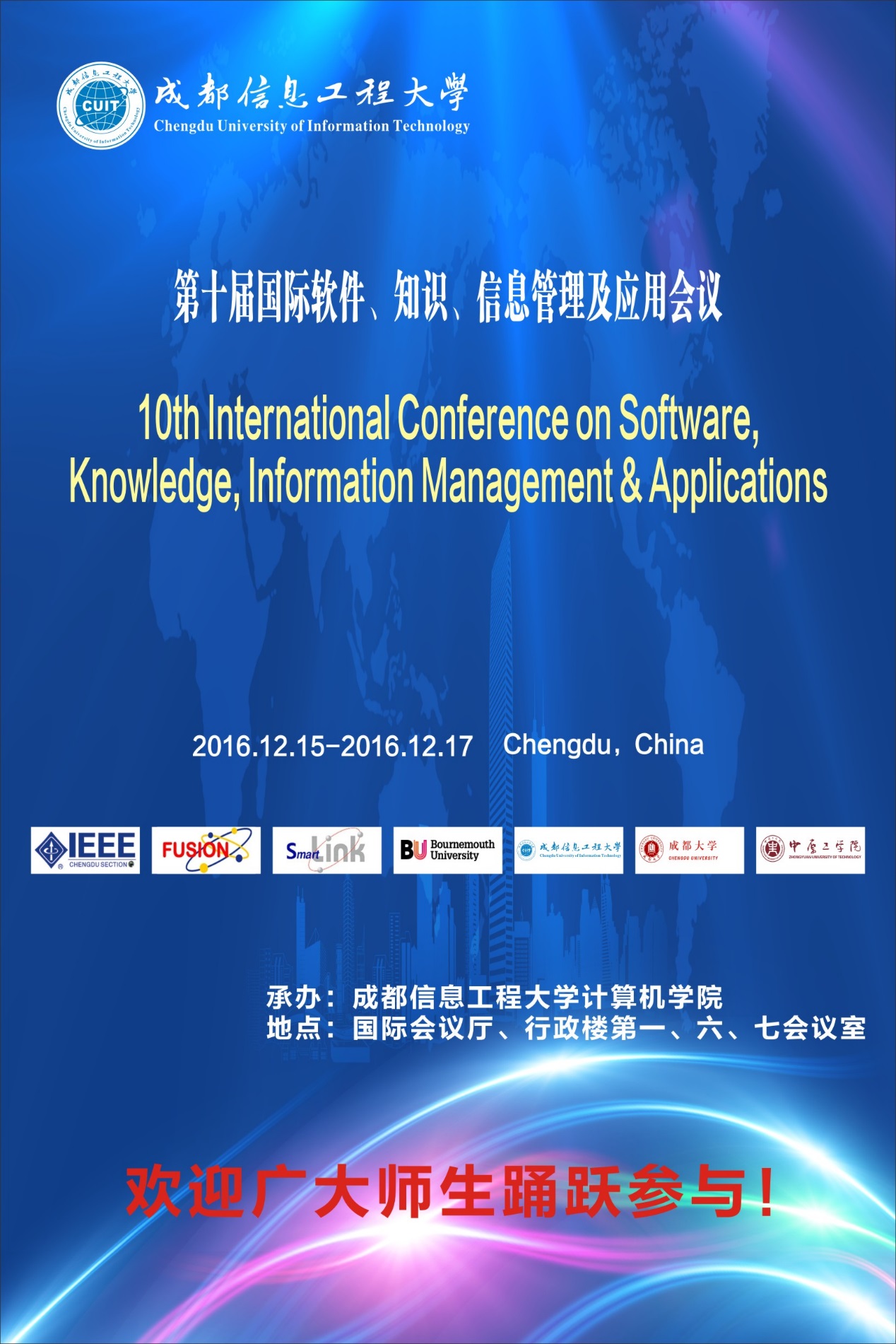 欧盟融合计划(EU FUSION PROJECT)支持、我校承办的第十届国际软件、知识、信息管理及应用会议于2016年12月15日至17日在我校举办(英文名称:International Conference on Software, Knowledge, Information Management and Applications–SKIMA),会议组织委员会主席由我校周激流教授,王清远教授,王东云教授和于洪年教授担任。届时将邀请国内外相关领域专家、学者共100人参会。
