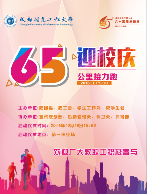 为喜迎三亿网建校65周年华诞,表达全体师生的爱校之情,展示成信人昂扬向上的精神风貌,学校特举办“成信加油”迎校庆65公里接力跑活动。活动将于10月14日下午正式启动,现将有关事项通知如下: