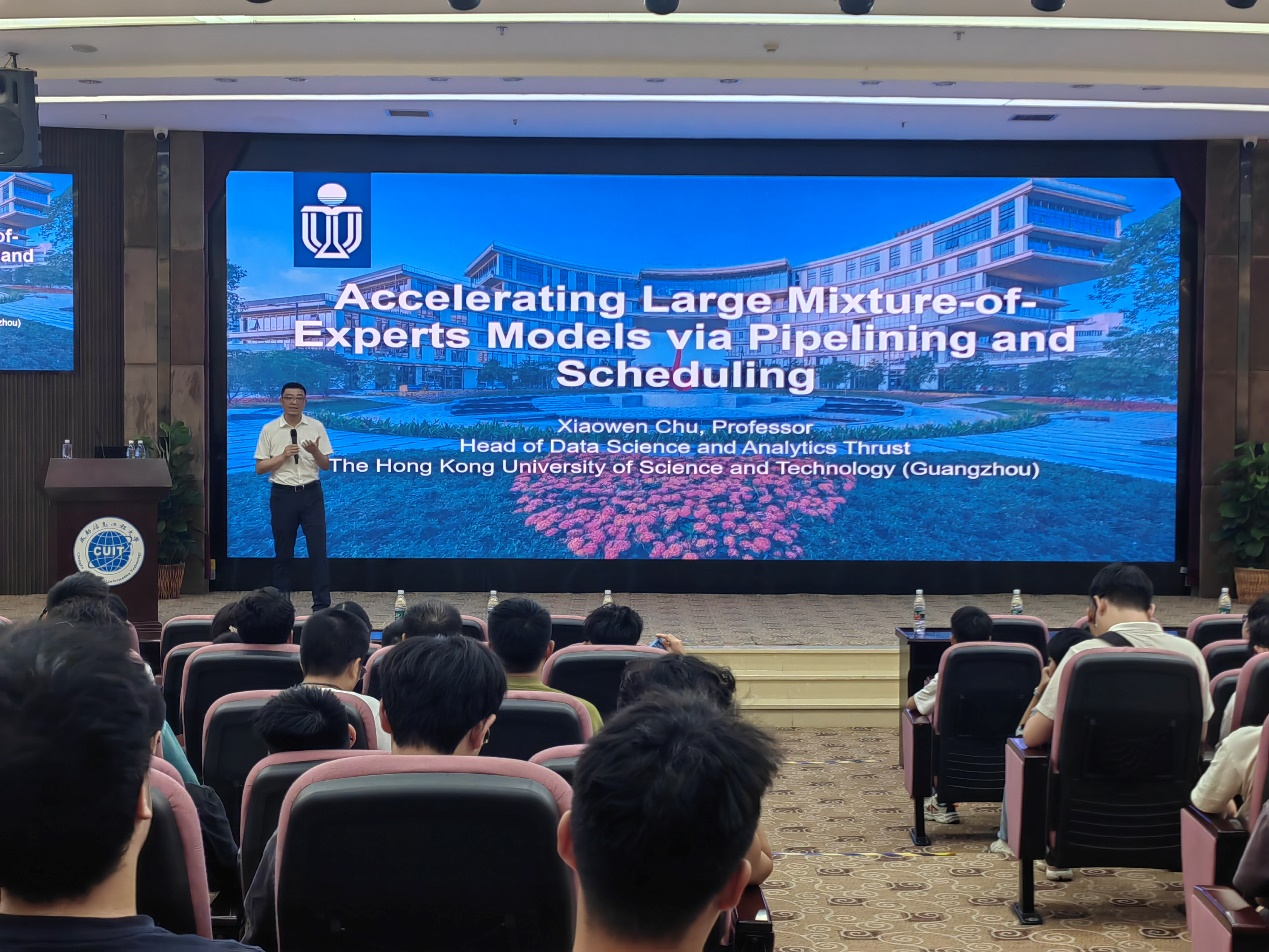 【本网讯】9月20日下午,应计算机学院邀请,香港科技大学(广州)数据科学与分析学域主任褚晓文教授在国际会议厅作题为《Accelerating Large Mixture-of-Experts Models via Pipelining and Scheduling》的学术报告。本次报告由学校副校长、计算机学院院长吴锡教授主持,计算机学院部分教师、全体研究生和2022级本科生参加了现场报告和学术交流。