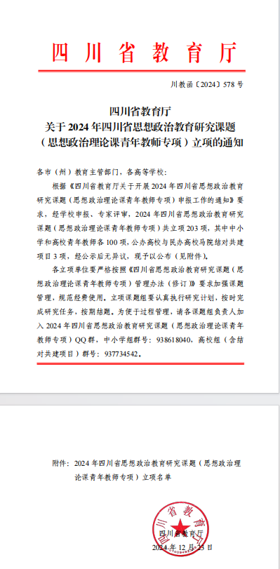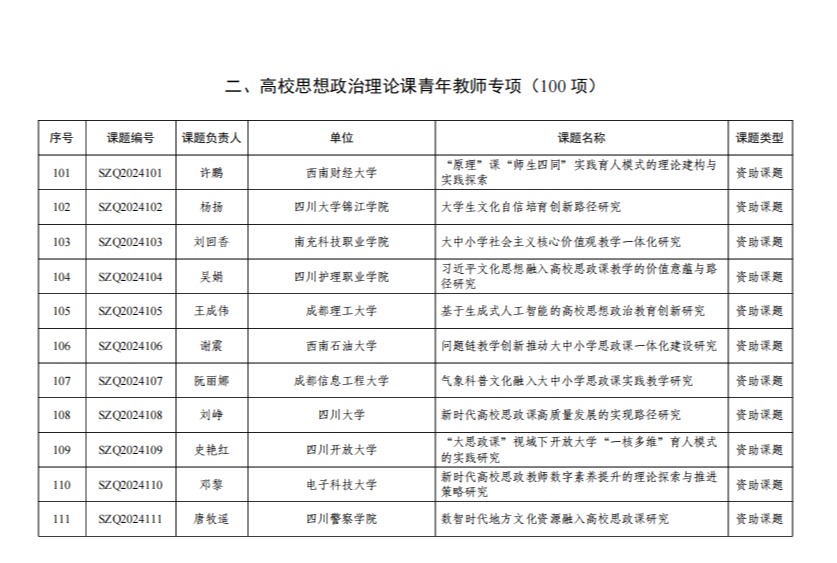 经学校申报、专家评审,2024年四川省思想政治教育研究课题(思想政治理论课青年教师专项)共立项203项,其中中小学和高校青年教师各100项,公办高校与民办高校马院结对共建项目3项。