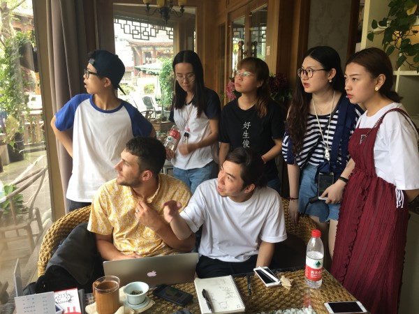在实践考察中,学生共被分为4组,分别由4位专业教师带领考察古镇特色。在考察过程中,学生们可利用工具随时拍摄、收集素材,进行初步的设计构思,并绘制草图,并及时地与Riley Vier教授交流想法与设计思路,听取Riley Vier教授的讲评及建议。学生们了解了洛带古镇的历史与特色,也采集了高质量的素材,并在Riley Vier教授的启发下获取了更多的灵感与更好的设计思路,受益匪浅。