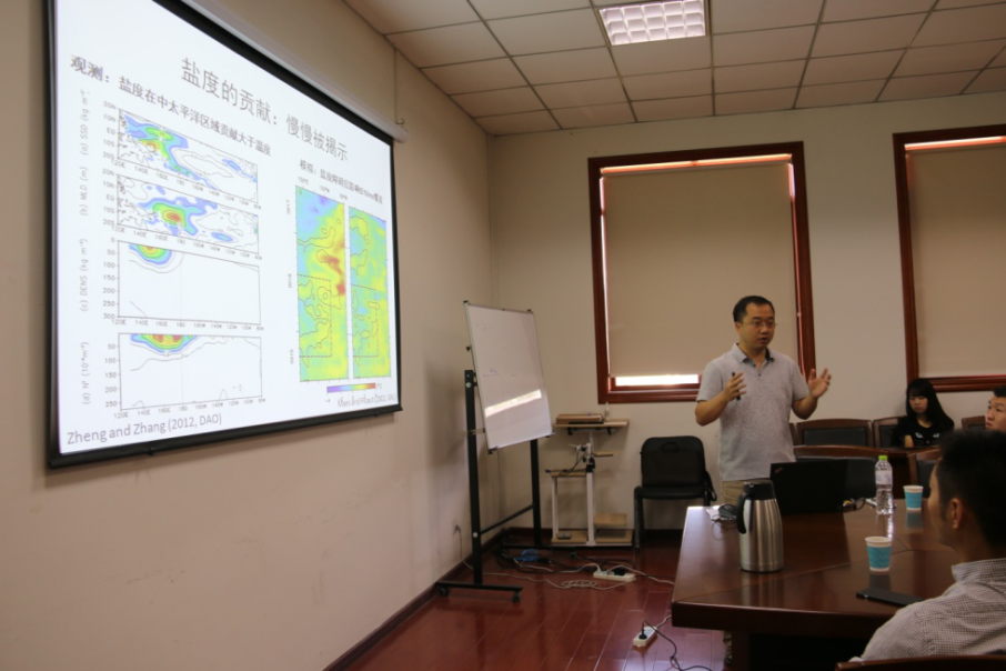 【本网讯】5月25日,中国科学院大气物理研究所郑飞研究员应邀在气象楼310会议室,作了题为《热带太平洋盐度过程对中太平洋型厄尔尼诺的正反馈机制及预报改进》的学术报告。大气学院部分老师和研究生参加了此次交流,报告由陈权亮教授主持。