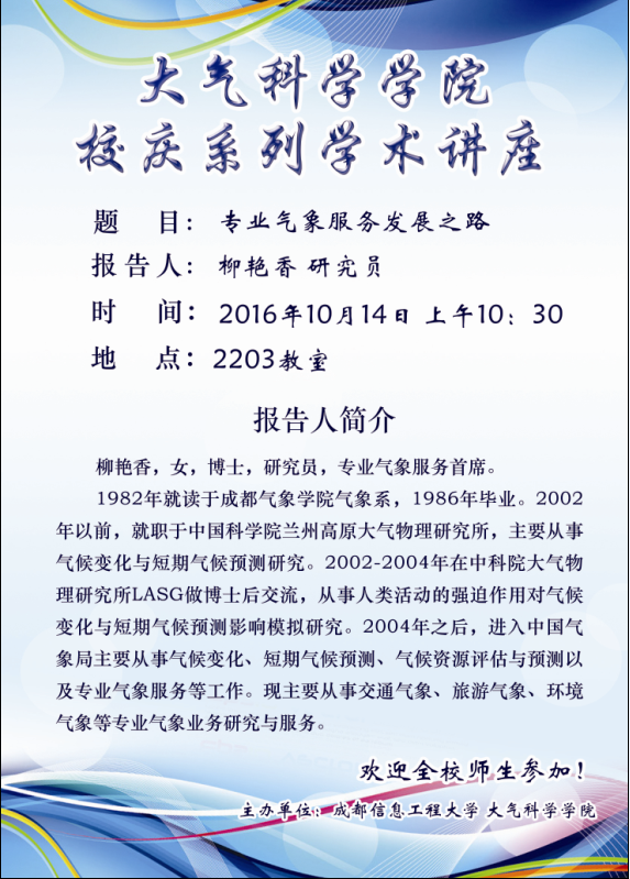 来源:大气科学学院 作者:梁家豪日期:2016-10-11 审核:新闻中心 点击:
