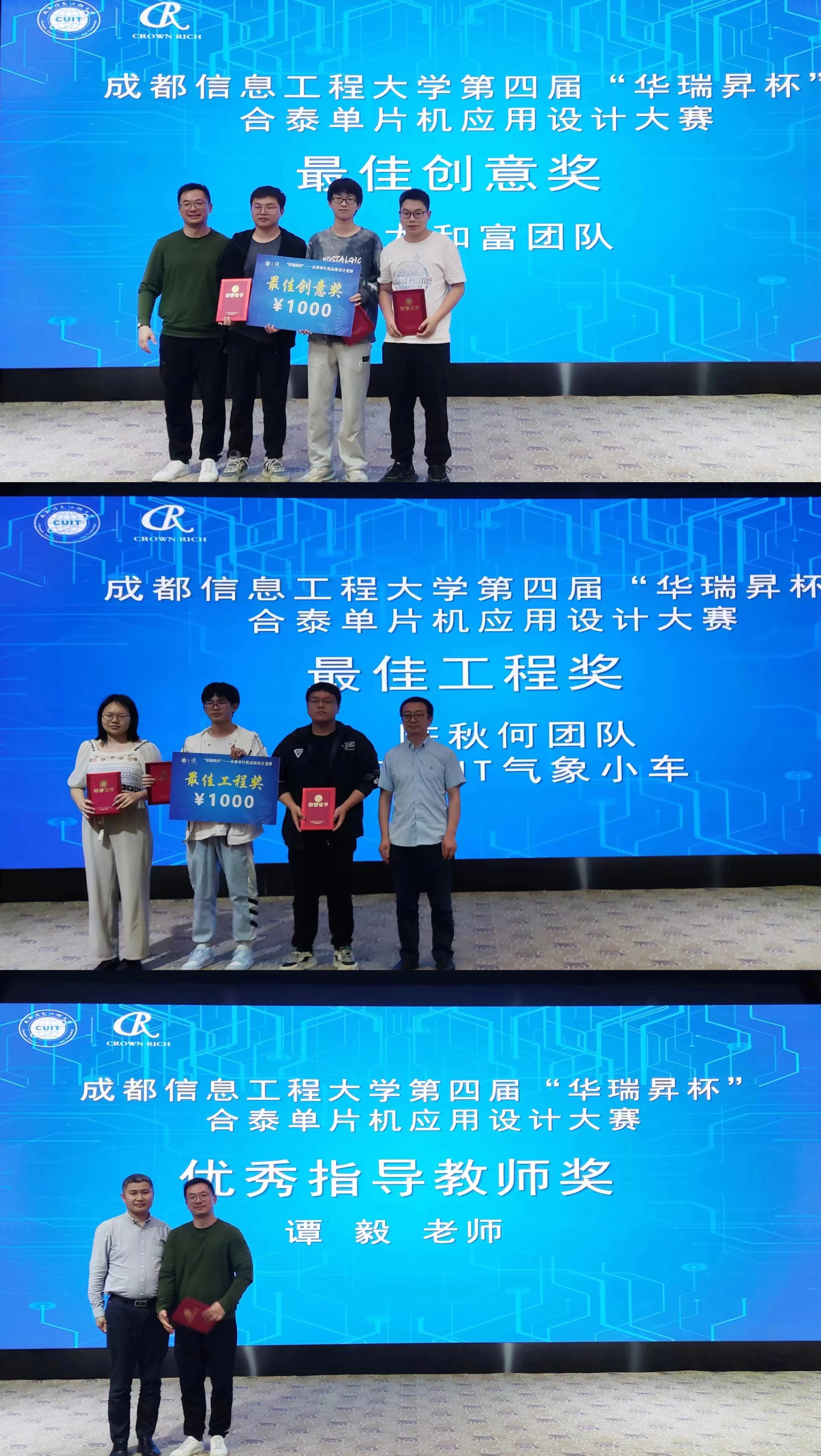 来自通信21级的杨子毅团队所设计的“基于合泰单片机的自助体液采集医疗辅助装置”获得了本届大赛的一等奖;集电21级的陈松团队所设计的“电动车智能供电桩”和通信22级的吉差木来团队所设计的“电动单车、 电动汽车的智能充电系统”获得了本届大赛的二等奖;电信21级的韩超团队所设计的“智能垃圾桶”、电信21级的蒋宇鑫团队所设计的“便携式运动健康手环”以及通信22级的陈佳昊团队所设计的“老年人智能家居联网主控系统”获得了本届大赛的三等奖;通信22级龙和富团队所设计的“多功能智能门锁”以及通信22级陈秋何团队所设计的“基于HT32F52352-64LQFP气象小车”分别获得了最佳创意奖和最佳工程奖;通信工程学院(微电子学院)谭毅老师获得了本届大赛的优秀指导教师奖。随后,颁奖嘉宾、获奖选手和到场学生一起观看了本届大赛的优秀作品展播。