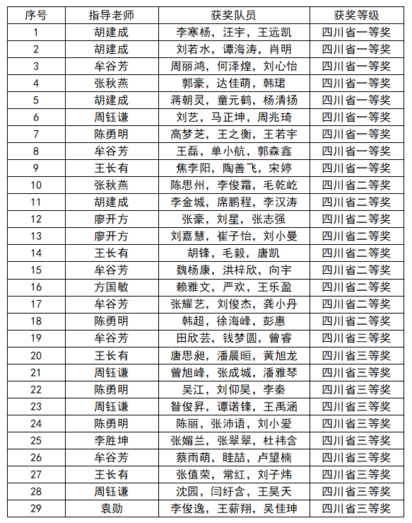 【本网讯】日前,“高教社杯” 全国大学生数学建模竞赛四川赛区成绩公布,我校共计29支队伍获奖,其中9支获省一等奖;9支获省二等奖;11支获省三等奖,获奖人数再创新高。详细获奖名单如下: