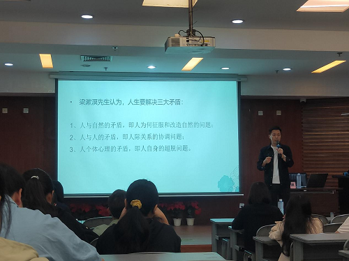 主题讲座邀请到华东师范大学教育学博士后、西南民族大学硕士生导师张海滨。张海滨从中国传统文化与心性论的角度,讲解了人和自然,人和人,人个体心理的矛盾,提出人本性的特征和心理健康的必要素养。