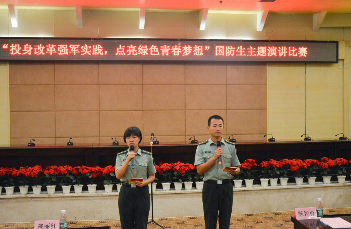 【本网讯】为丰富国防生文化实践活动,激发国防生爱国热情,进一步增强他们为国防事业奉献青春的责任感、使命感;同时为在校国防生创造和提供一个展示自我风采、提升综合素质的平台,我校于6月6日在国际会议厅举办了“投身改革强军实践,点亮绿色青春梦想”国防生主题演讲比赛。