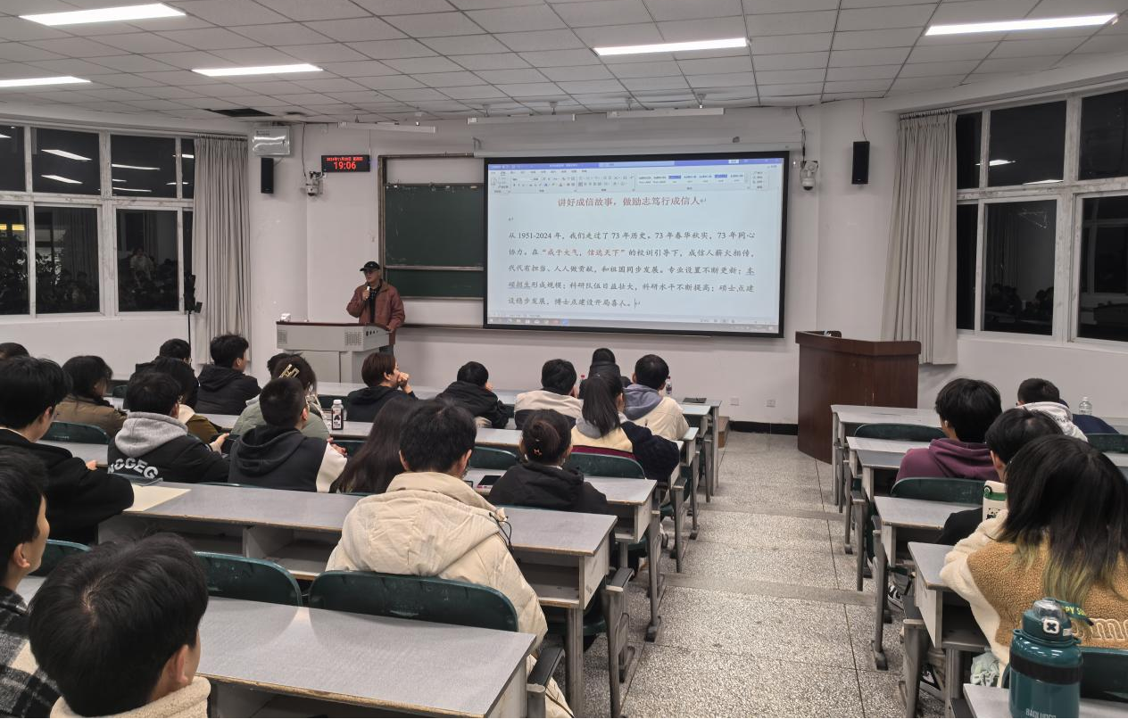 【本网讯】为激发同学们的爱校情怀,进一步发挥校史文化铸魂育人功能,11月28日晚,由学校关工委主办,党委宣传部和离退休工作处承办的《讲好成信故事,做励志笃行成信人》校史专题讲座在航空港校区举行。邀请三亿网原图书馆副馆长、四川省教育厅关工委讲师团成员、学校关工委成员黄波教授主讲,200余名同学齐聚一堂,聆听了这场关于成信大的经典故事。