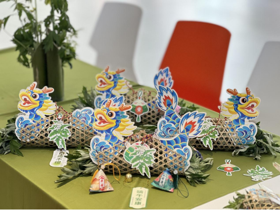 龙舟艾叶制作区弥漫着淡淡艾香,同学们巧手制舟,彩绳穿过竹片,中国龙连接竹片两头,再搭配粽子、风铃等端午元素,打造了一艘艘小巧又精致的艾草龙舟。古老的技艺在新时代的校园里焕发出蓬勃生机,仿佛在历史长河中点亮了一道璀璨的薪火传承之光。