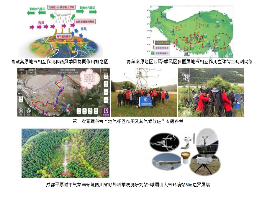 青藏高原地区地气相互作用过程对季风和西风的协同作用区的天气预报和气候预测有着直接影响,同时对亚洲水塔的形成和变化有重要影响。针对青藏高原地气相互作用研究,组建了大气边界层塔组网观测、双波段闪烁仪组网观测、风温廓线仪组网观测、微波辐射计组网观测、无线电探空系统组网观测、风吹雪组网观测、无人机组网观测和土壤温湿度组网观测等。基于协同观测结果在国内首先建立了高原热源的多元数据集,为团队和相关领域的研究提供了坚实的数据基础。