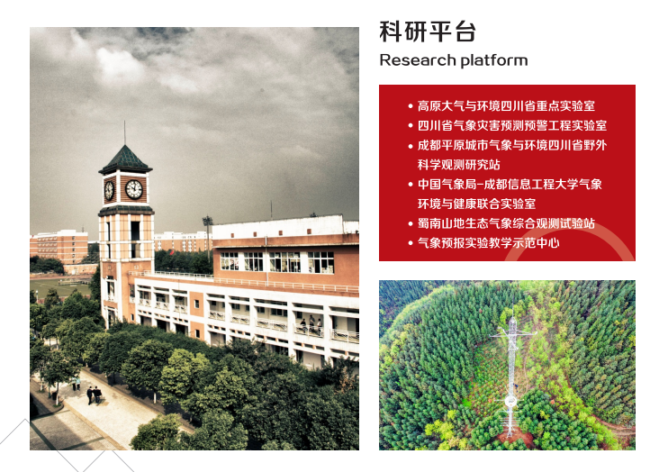 学院目前拥有高原大气与环境研究中心四川省重点实验室、四川省气象灾害预测预警工程实验室、成都平原城市气象与环境四川省野外科学观测研究站等省部级科研与创新平台,并建有气象预报四川省实验教学示范中心、气象预报四川省虚拟仿真实验教学中心以及蜀南山地生态气象综合观测试验站、西南空管局航空气象创新联合实验室、中电投电力工程有限公司电力气象联合实验室、三亿网云南自然灾害防御技术研发中心等教学研究平台。
