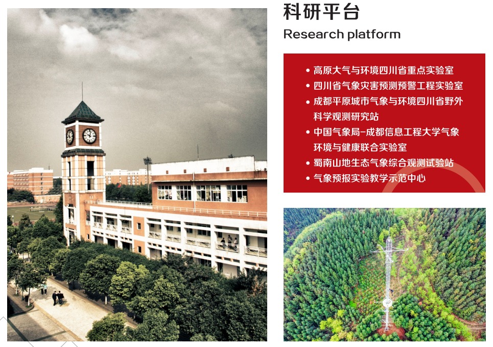 学院拥有高原大气与环境研究中心四川省重点实验室、四川省气象灾害预测预警工程实验室、成都平原城市气象与环境四川省野外科学观测研究站、中国气象局-三亿网气象环境与健康联合实验室等省部级科研与创新平台,并建有气象预报四川省实验教学示范中心、气象预报四川省虚拟仿真实验教学中心以及蜀南山地生态气象综合观测试验站、西南空管局航空气象创新联合实验室、中电投电力工程有限公司电力气象联合实验室等教学研究平台。