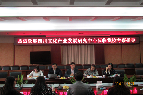 [本网讯] 10月23日,四川文化产业发展研究中心办公室主任邱明丰、四川文化产业职业学院科技处副处长张学勤等一行五人来我院四川网络文化研究中心进行考察交流,学院党委副书记、四川网络文化研究中心主任敬枫蓉,副主任蓝鹰,文化艺术学院副院长廖思湄等接待来宾并交流。