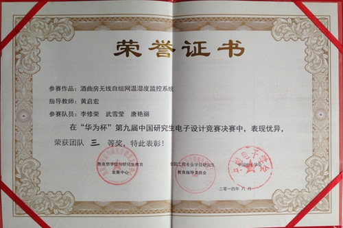 8月18日至20日,“华为杯”第九届中国研究生电子设计竞赛全国决赛在西安电子科技大学举行,来自全国67所高校的116支队伍,共计400余名师生参加了竞赛。7月初,由通信工程学院2013级研究生李修荣、电子工程学院武雪莹、唐艳丽三名同学组成的队伍(指导老师黄启宏)经过初赛后获得西南分赛区团体一等奖,成为了我校唯一一支进入全国总决赛的队伍,并在此次决赛中荣获团体三等奖的可喜成绩。同时,以“创新,创意,创业”为原则参了“商业计划书”评比,在全国37支队伍参加的比赛中喜获商业计划书三等奖。