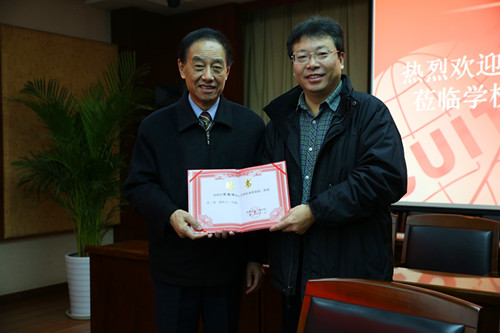 周激流为侯朝焕院士颁发了兼职教授聘书。他向侯朝焕院士简要介绍了学院近年来学科建设,特别是信息学科发展的情况。他表示,侯朝焕院士成为学校兼职教授,这对学校的学科建设和博士点建设都将起到积极的推动作用。