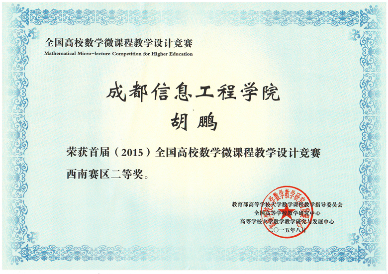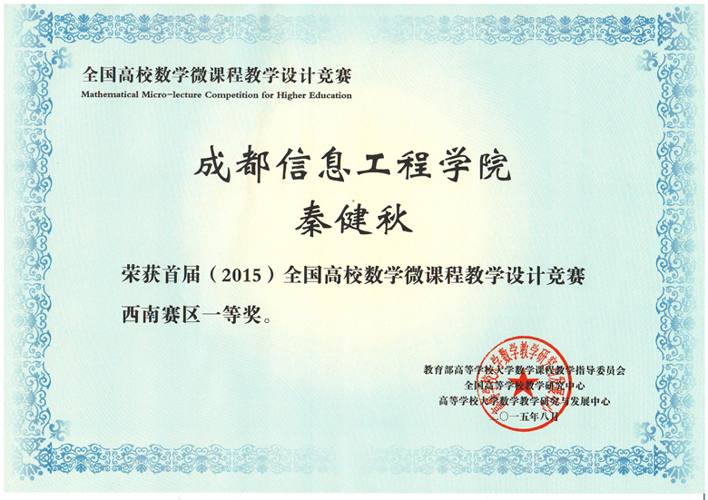首届(2015)全国高校数学微课程教学设计竞赛分为赛区初赛和全国决赛两级,在赛区初赛中有来自四川大学、重庆大学、西南财经大学、电子科技大学、三亿网、云南大学、云南财经大学、贵州大学、贵州师范大学等的高校教师参加高等数学、线性代数、概率论与数理统计三门课程的比赛。我院组织的4位教师参加了比赛,秦健秋老师的《高等数学》获一等奖、胡鹏老师的《经济数学》获二等奖。