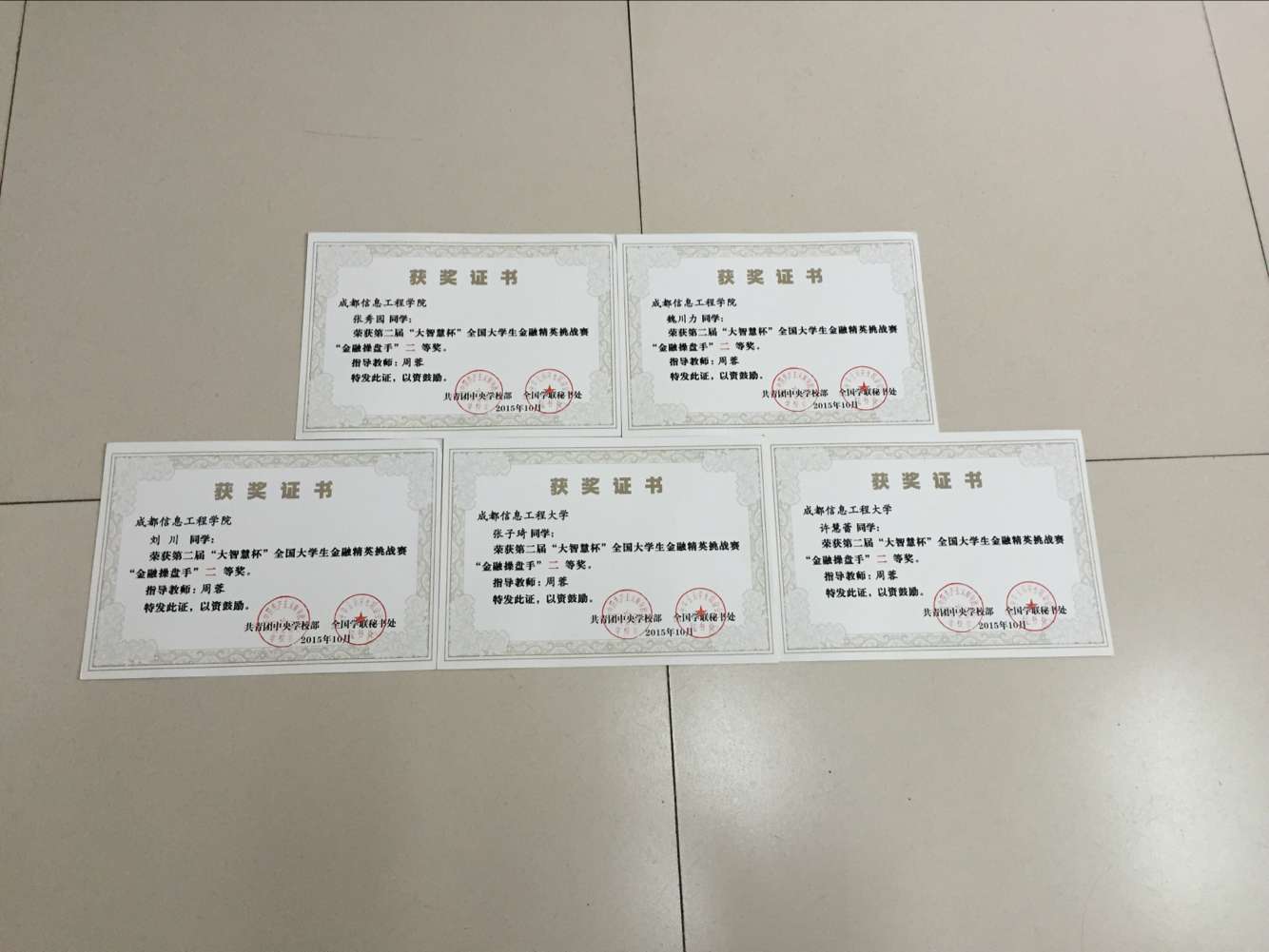 【本网讯】 近日传来喜讯,我校学生在团中央学校部、全国学联秘书处举办的2015年第二届“大智慧杯”全国大学生金融精英挑战赛中取得优异成绩,一等奖1项、二等奖5项、三等奖21项。商学院周蓉老师获优秀指导教师奖。该成绩在西南地区进入前10名。