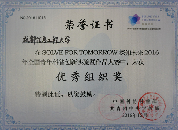 【本网讯】近日,由中国科协、共青团中央主办,中国科学技术馆、中国科协青少年科技中心承办,中国三星独家赞助的“SOLVE FOR TOMORROW探知未来2016年全国青年科普创新实验暨作品大赛”颁奖典礼在北京中国科技馆隆重举行,凭借20余支团队的较好创意作品,我校被授予活动“优秀组织奖”。