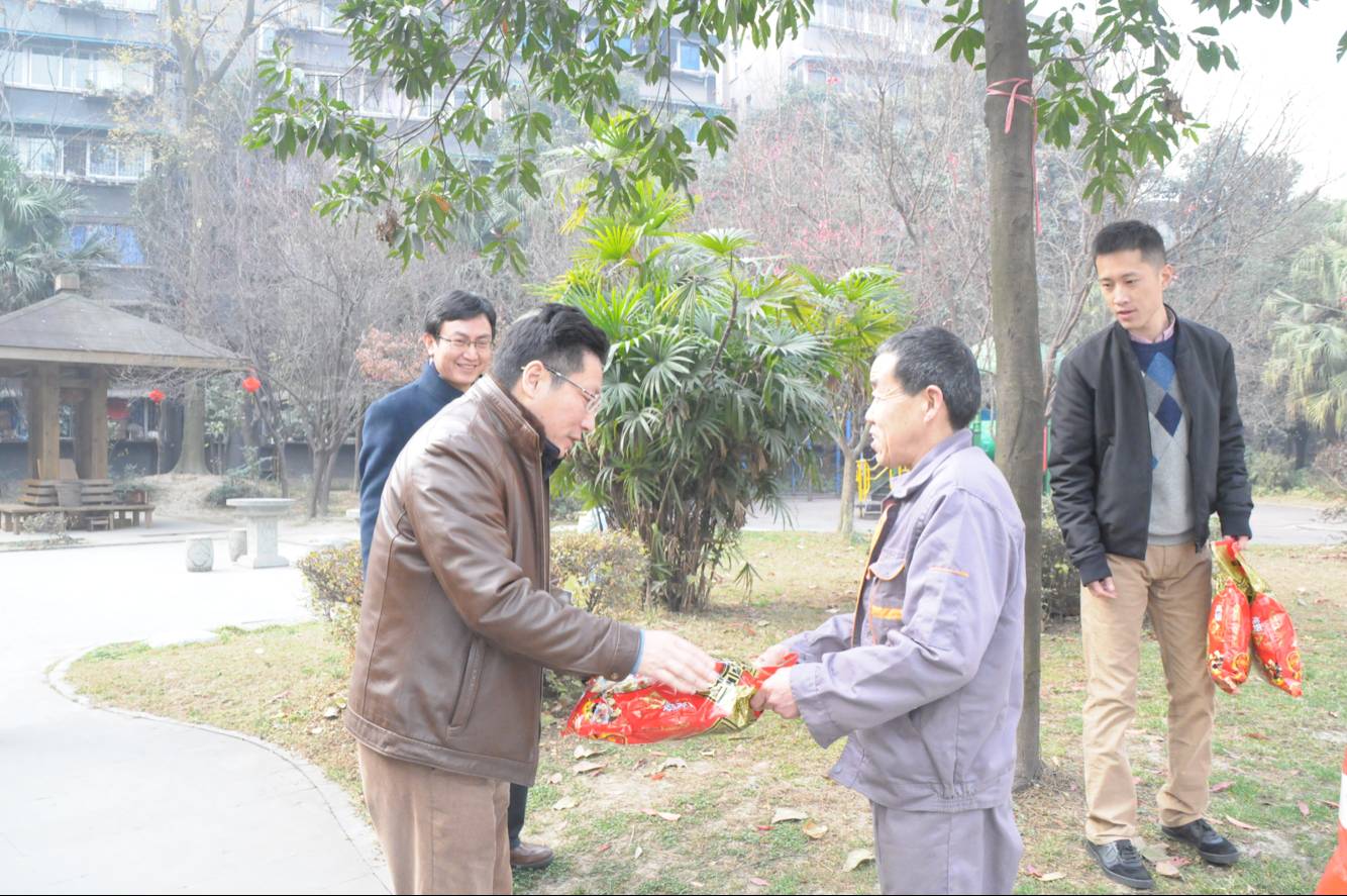 【本网讯】1月25日,受学校党政委托,学校副校长马洪江到人南校区看望成都新气象宾馆以及新气象小区春节期间坚守在一线的工作人员。在小区车场、安保室、值班室、客房部、茶坊、餐厅等部门,马洪江亲切和大家交谈,向他们致以新年问候和新春祝福,并送上节日慰问。四川成信资产经营有限公司等部门负责人陪同慰问。