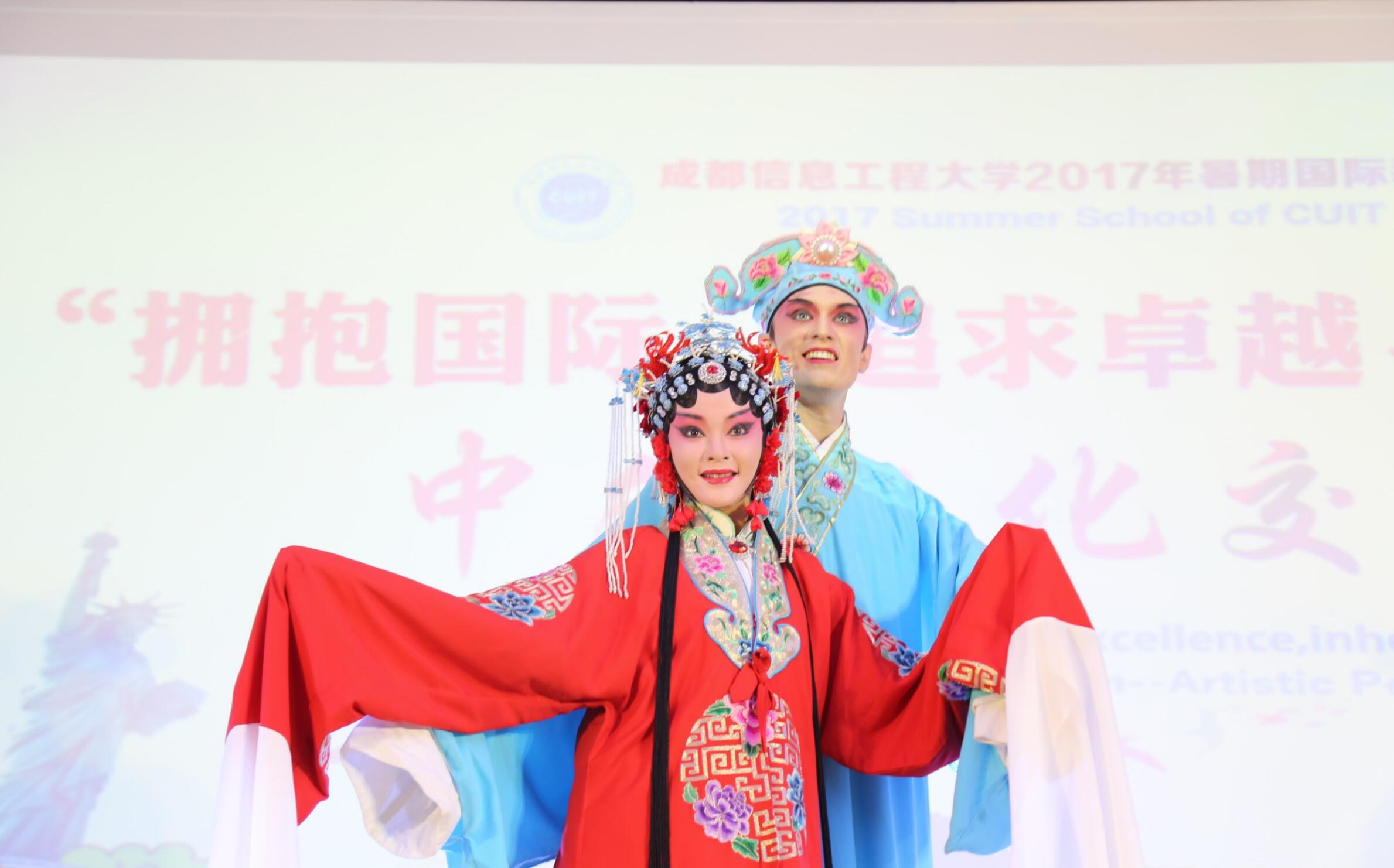 学校大学生艺术团A MUSE组合用充满青春和活力的流行舞《playing with fire》开场。《美猴王》的演绎,让美猴王的形象呼之欲出。由国家级非物质文化遗产川剧代表性传承人肖德美的弟子白爱伦带来的戏曲身段表演,让观众们感受到了中华传统文化的吸引力和川剧的独特魅力。互动环节上,两位中国非物质文化遗产——剪纸、糖画传承人为外宾送上精美的剪纸作品以及形状各异的糖画作品,他们不仅现场演示制作过程,还教授现场观众剪纸技艺,让全场师生对中国传统技艺有了更直观的了解,也让外籍专家感受到了中国传统文化的魅力。由艺术家们及大学生艺术团带来的二胡独奏《战马奔腾》、流行歌曲演唱《All about that bass》、双人舞《大鱼》、民歌独唱《在那东山顶上》、魔术表演、川剧变脸等精彩节目轮番登场,赢得了现场观众的阵阵掌声。