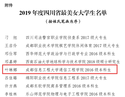 其中,我校通信工程学院2016级学生叶琳娜被授予“2019年度四川省最美女大学生”荣誉称号。