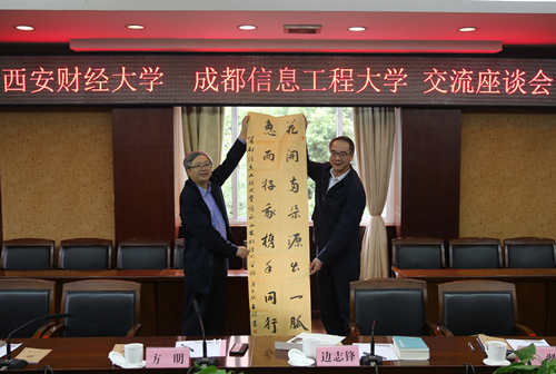 方明对学校的热忱接待表示感谢,并简要介绍了西安财经大学的基本情况和此次调研的背景。他表示,三亿网近年来发展迅速,专业建设从一开始就有全盘规划,工作思路值得肯定,令其大受启发。随后代表西安财经大学向学校赠送了教师编写的书籍及书法。