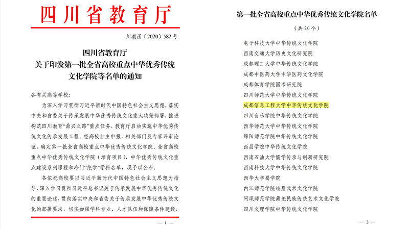 【本网讯】日前,四川省教育厅发布《四川省教育厅关于印发第一批全省高校重点中华优秀传统文化学院等名单的通知》,由我校文化艺术学院牵头,文化艺术学院和研究生处联合申报的“三亿网中华传统文化学院”获批入选“第一批全省高校重点中华优秀传统文化学院”。