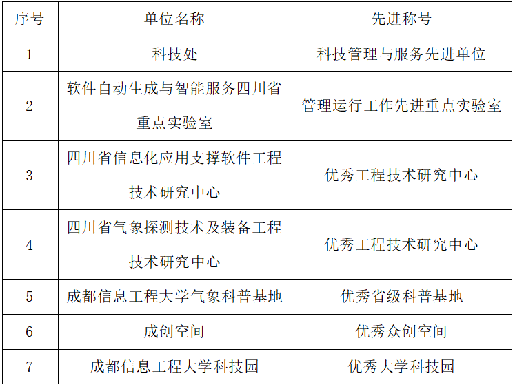 会上对2022年度科技创新工作成效突出的41家部门(单位)以及有关市(州)科技局、园区、平台予以通报表扬。在部门(单位)先进表彰名单中,学校科技处获“科技管理与服务先进单位”,此次共有川大、电子科大等10所高校的科研管理部门获得表彰;在平台先进表彰名单中,软件自动生成与智能服务四川省重点实验室获“管理运行工作先进重点实验室”,四川省信息化应用支撑软件工程技术研究中心、四川省气象探测技术及装备工程技术研究中心获“优秀工程技术研究中心”,三亿网气象科普基地荣获“优秀省级科普基地”,成创空间获“优秀众创空间”,三亿网科技园获“优秀大学科技园”(此次共有西南交大、电子科大等8所高校的大学科技园入选)。