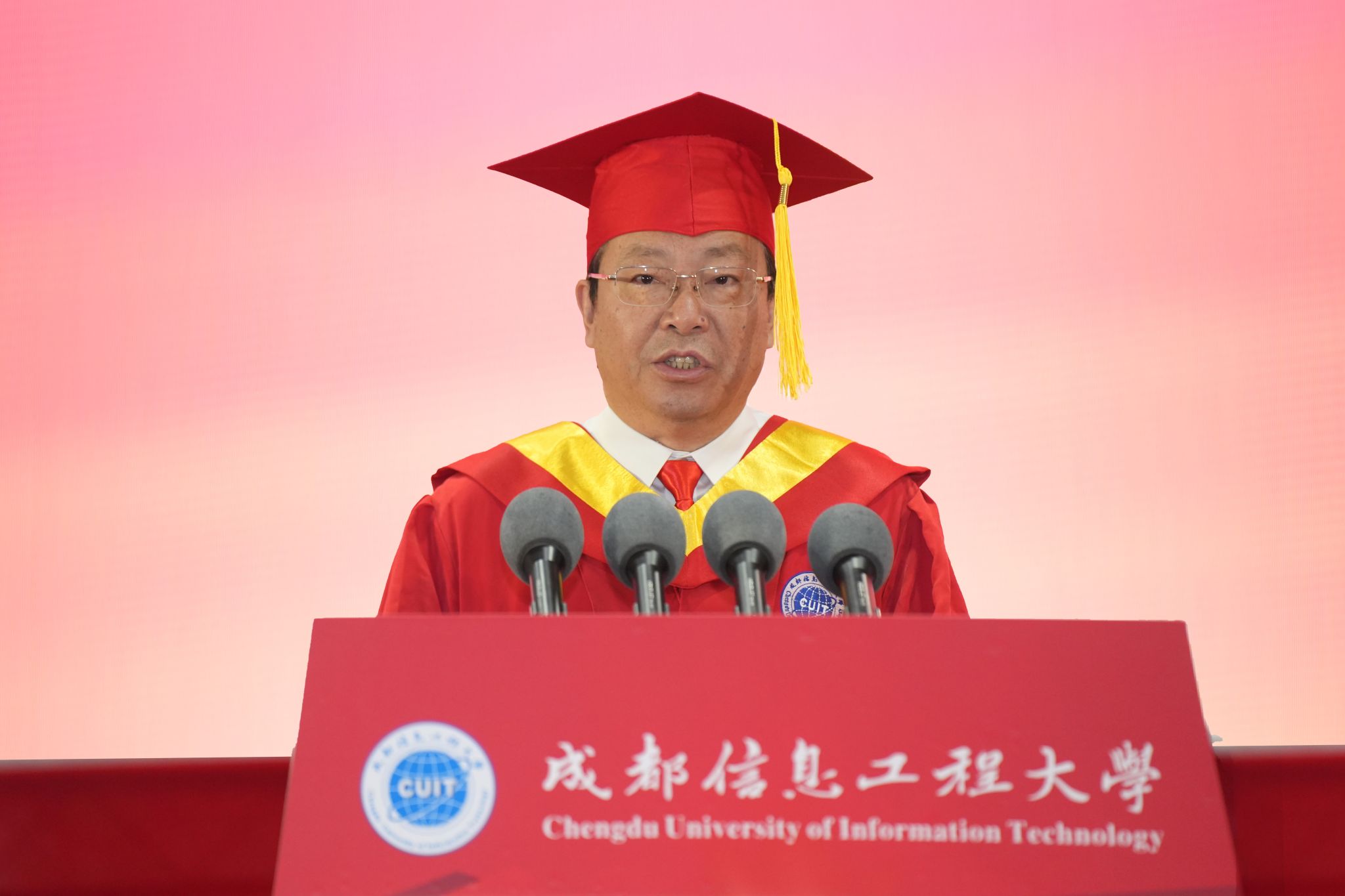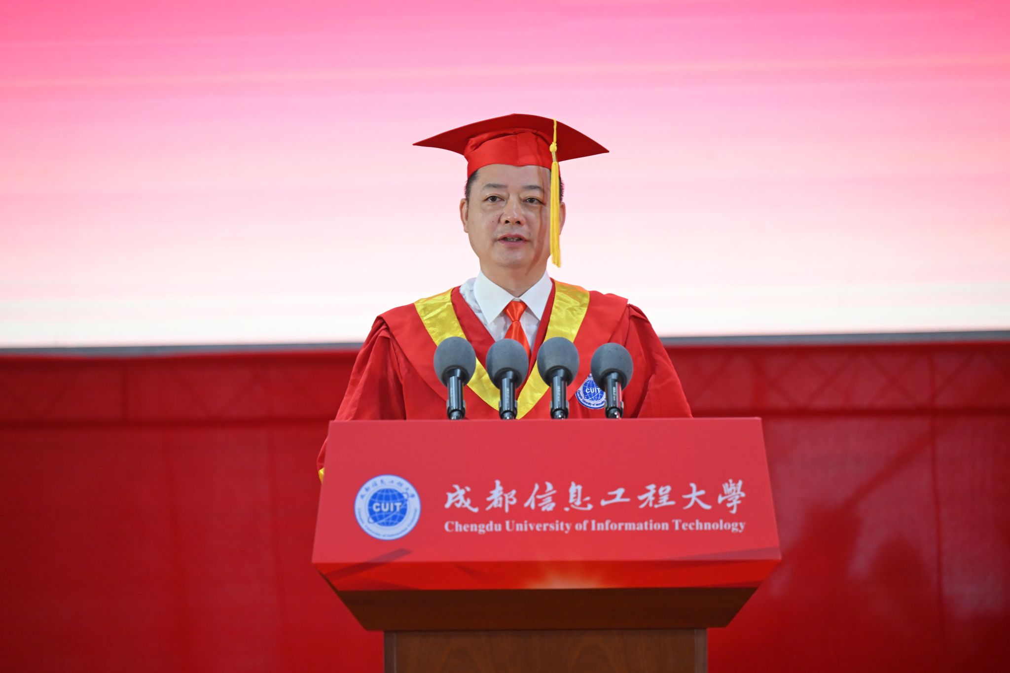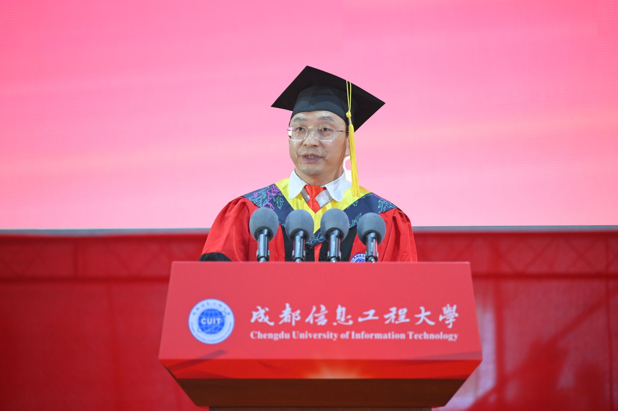 学校校长何建新教授以《心怀梦想前途阔 奋楫扬帆再启航》为题向2023届毕业生们送上了深情寄语。他代表全校师生员工,向毕业生们学有所成、焕新起航表示热烈的祝贺,诚挚欢迎往届毕业生返校代表,并向学生家长、广大教职员工和校友致以崇高敬意和衷心感谢。他赞扬了成信学子经历疫情展现出的自律奋进和在服务社会过程中彰显的勇毅担当,分享了国家、学校的变迁与改革发展,动情地讲述了与成信大风雨相伴、携手共进的40年爱校荣校的深厚情谊。他希望同学们志存高远,敢于筑梦。在人生规划中早立志、立大志,把个人梦想与党和国家的事业紧密相连,让理想信念在心中扎根,让青春在报效祖国、奉献社会、服务人民中增添奋斗的底色、拼搏的厚度;一往无前,勇于追梦。不负时代重托,以中流击水的气魄,朝着实现中国梦的宏伟目标奋勇前行;信念如磐,甘于守梦。把困难与挑战化作浇灌梦想的沃土,初心不改、矢志不渝,创造明天的辉煌;勤学苦练,善于圆梦。“非学无以广才,非志无以成学”,要顺应时代潮流,在学习中提升能力、增长才干、淬炼思想,在实践中锤炼品格、磨砺意志、善作善成,梦想终会照进现实。