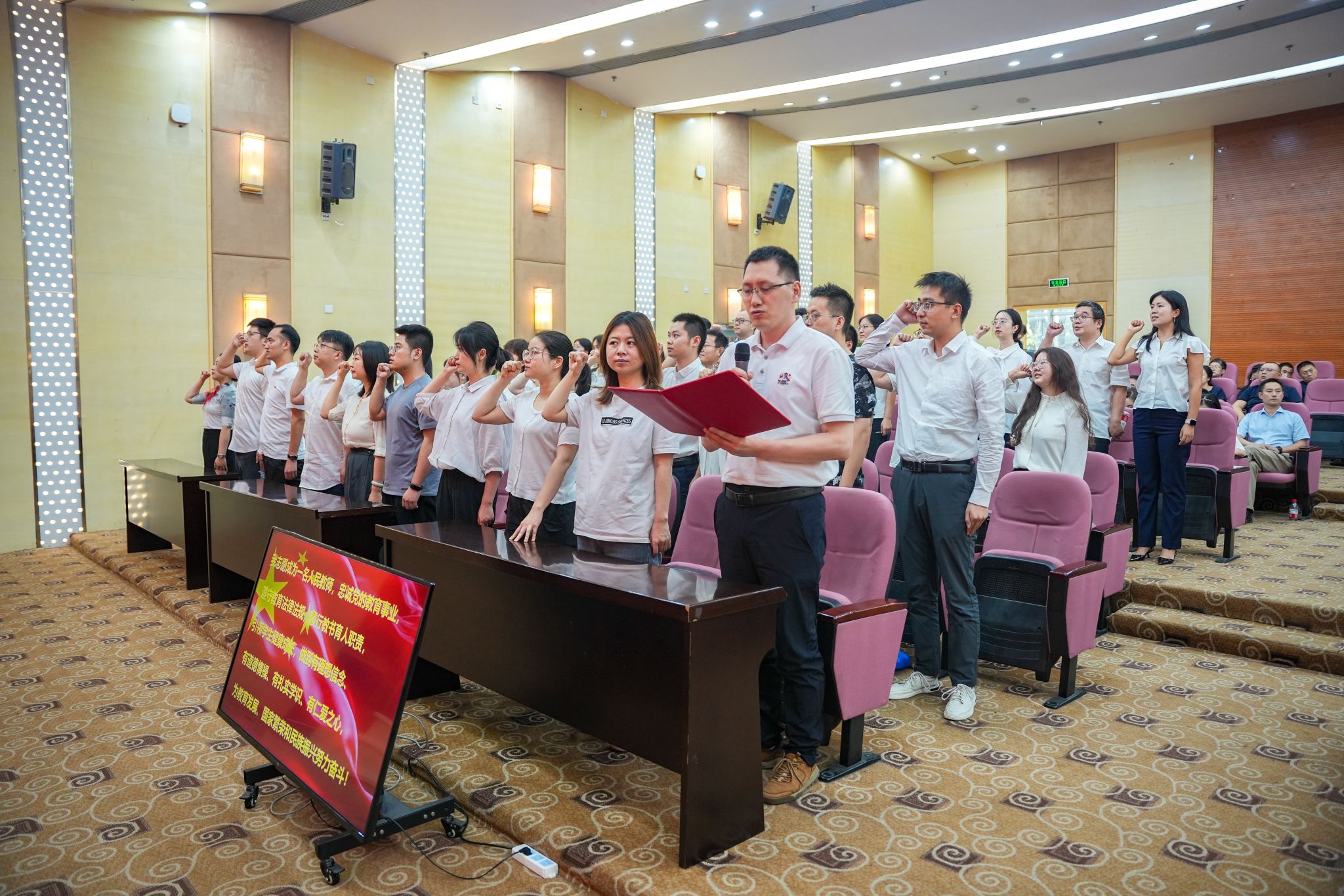 表彰大会现场,电子工程学院的陈军全老师代表新进教师领誓,全体新进教师庄严宣读师德誓词,用铮铮誓言激励自己坚守对教师职业的热爱、敬畏与感动,为提升学校人才培养质量砥砺奋斗。