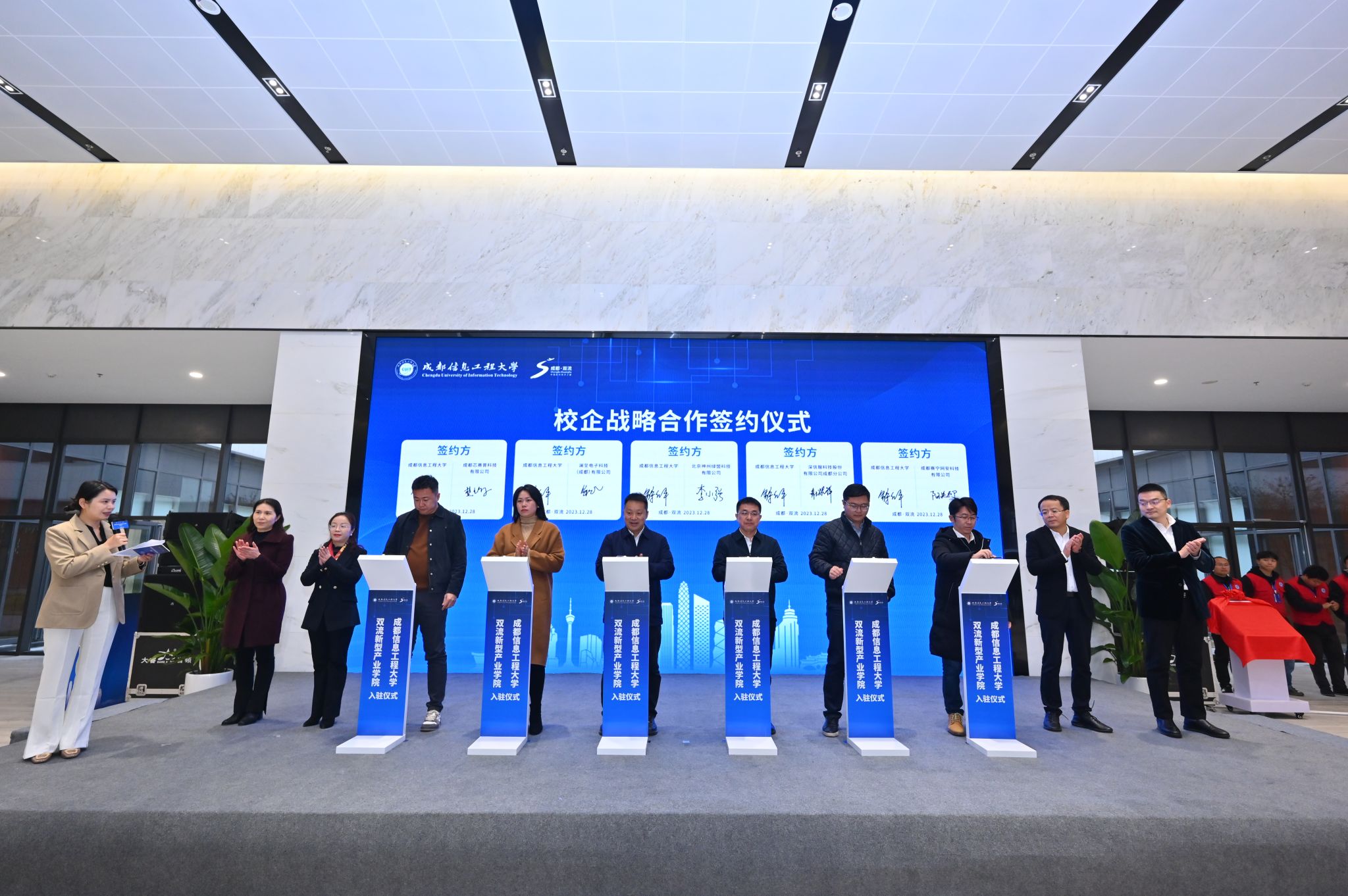 【本网讯】12月28日,三亿网双流新型产业学院入驻仪式在成都芯谷举行。三亿网双流新型产业学院、三亿网交叉学科研究院、三亿网科技园芯谷园区、三亿网学生实习实训平台揭牌成立。学校党委书记沈火明,党委副书记、校长何建新,双流区委书记欧昭,区委副书记、区长杨钒出席仪式并揭牌。