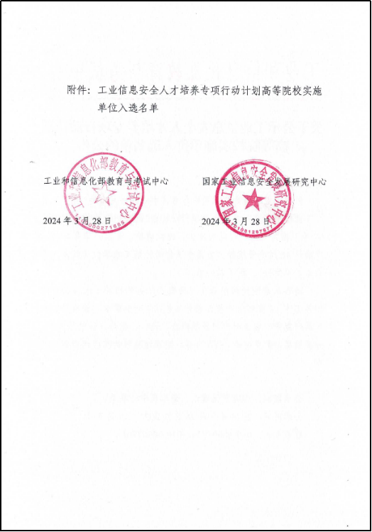 【本网讯】2024年3月,工业和信息化部教育与考试中心发布《关于公示工业信息安全人才培养专项行动计划高等院校实施单位入选名单的公告》。按照工业和信息化部教育与考试中心联合发布的《关于开展“工业信息安全人才培养专项行动计划”的通知》(工信教〔2023〕67号)相关要求,经院校申报、组织遴选、专家评审等环节,确认48所高等院校为首批专项行动计划实施单位。