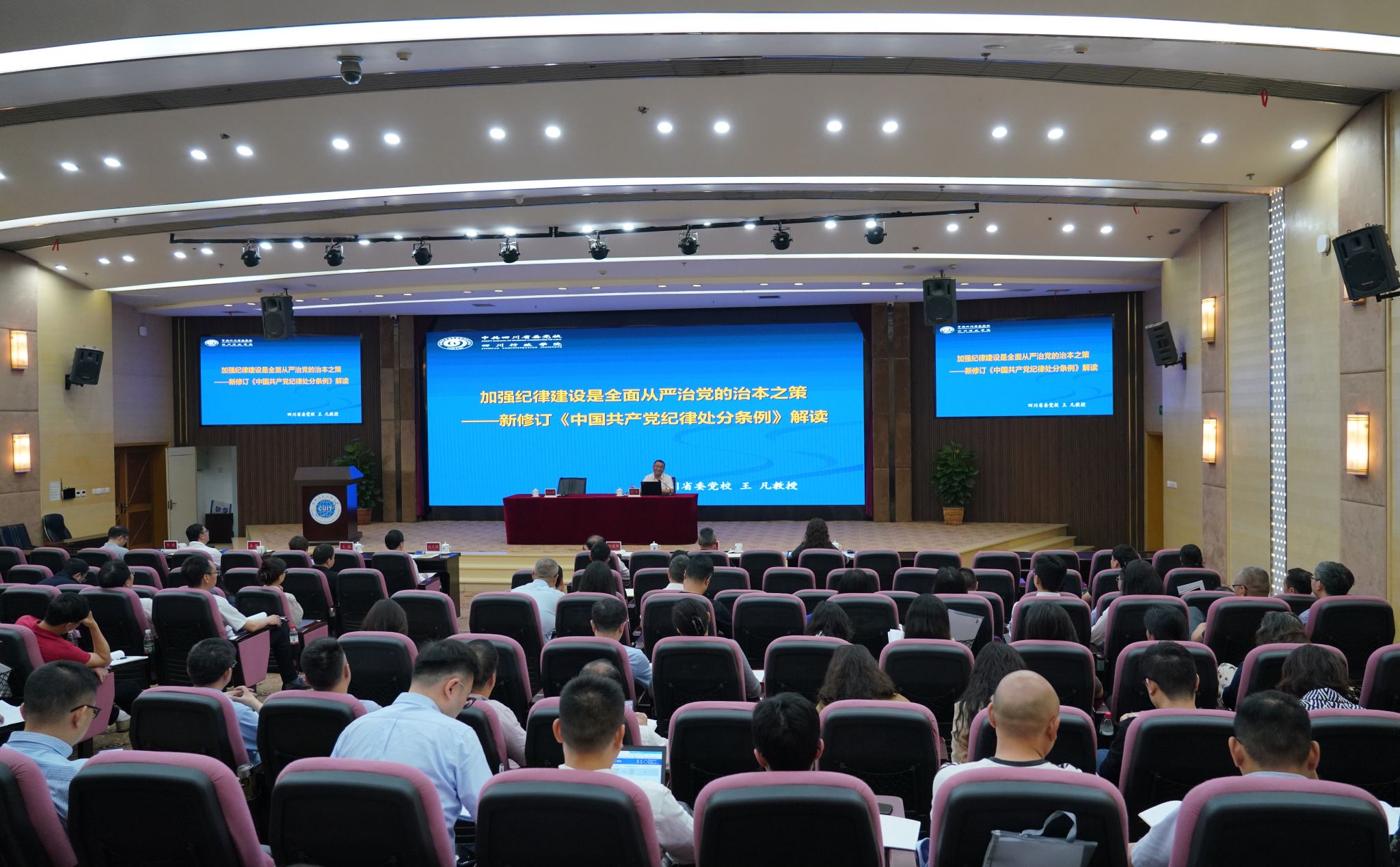 【本网讯】4月28日上午,学校党委在航空港校区国际会议厅举办党纪学习教育读书班专题辅导报告会,特邀四川省委党校、党建教研部主任王凡教授来校作党纪学习教育专题辅导报告。全体校领导、全体中层干部150余人参加。报告会由学校党委书记沈火明主持。