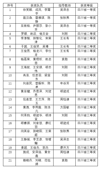 日前,从全国大学生数学建模竞赛四川赛区组委会获悉,我校有21支参赛队获奖,其中3支参赛队获四川省一等奖,4支参赛队获四川省二等奖,14支参赛队获四川省三等奖,成绩优异。详细名单如下。