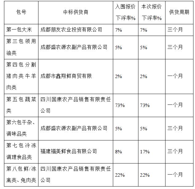 根据框架协议,现将三亿网2022年度食堂大宗物资采购项目(项目标号:QXZB-2022-0433X)第二阶段第一竞价周期报价竞价,确定以下单位成为成交供货商。结果公示如下: