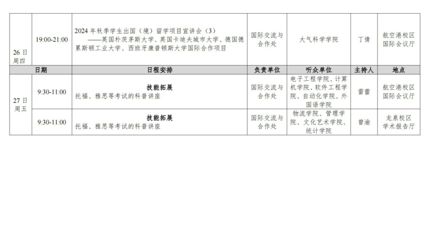 学校将于2024年9月20日至27日举行“全球视野·共筑未来”国际教育周活动。该活动核心聚焦于学生成长与全球视野拓展,通过多元化、互动式的交流平台,深化学生对国际议题的理解。组织国际学术沙龙,鼓励学生围绕跨学科议题自由发言,激发创新思维;并推出名师课堂,邀请各领域名师授课,打破地域限制,让学生随时随地享受全球优质教育资源。还将举办海外升学与就业辅导会,为学生量身打造个性化发展路径。整个教育周以学生为中心,旨在通过实践活动与理论学习相结合,提升学生的国际竞争力与跨文化交流能力,为其成为具有国际视野的复合型人才奠定坚实基础。现将活动日程安排通知如下,欢迎广大师生积极参与!