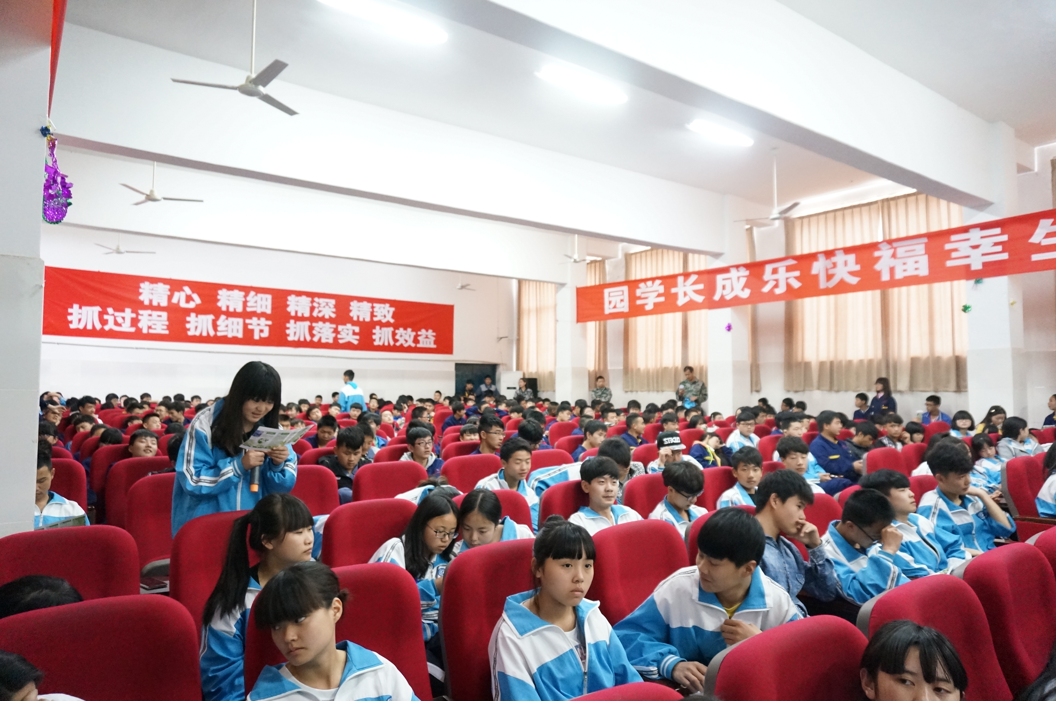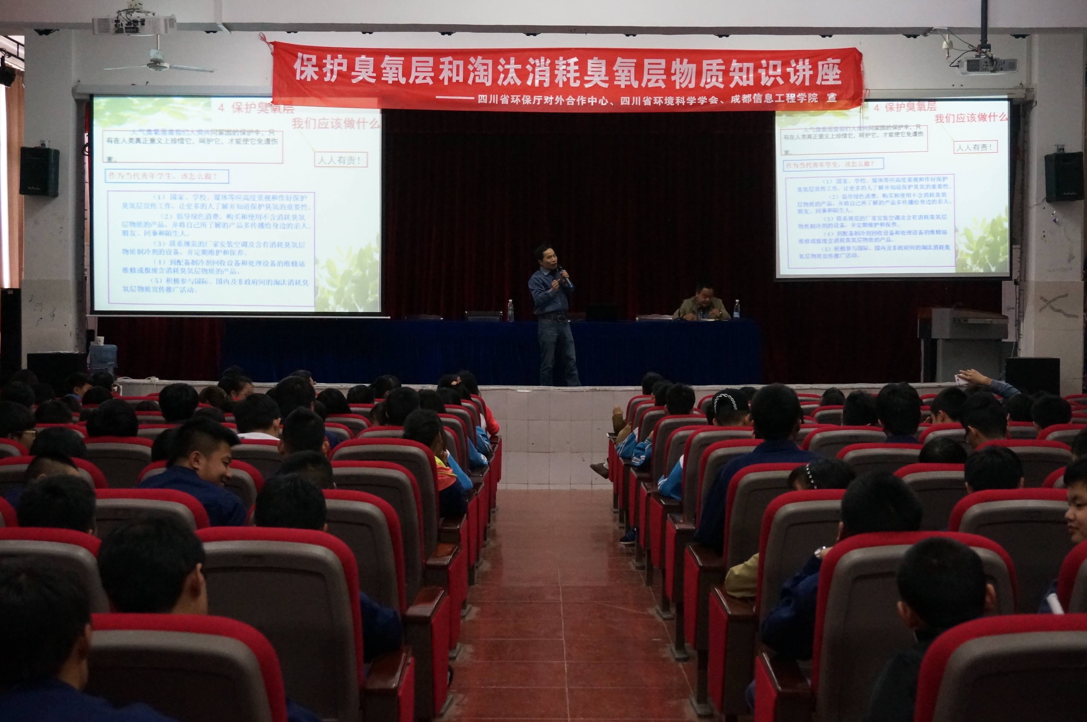 [本网讯]2015年4月7日下午,由四川省环境保护厅主办,四川省环保厅对外合作中心、四川省环境科学学会和成都信息工程学院资源环境学院共同承办题为“保护臭氧层和淘汰消耗臭氧层物质知识”讲座在龙泉驿区成都汽车职业技术学校学术中心举办。四川省环保厅对外合作中心周丹、四川省环境科学学会邹伯祥、成都信息工程学院部分教师、研究生及成都汽车职业技术学校部分教师、高一年级300多名学生参加了讲座。讲座由成都信息工程学院资源环境学院杨怀金老师主讲。