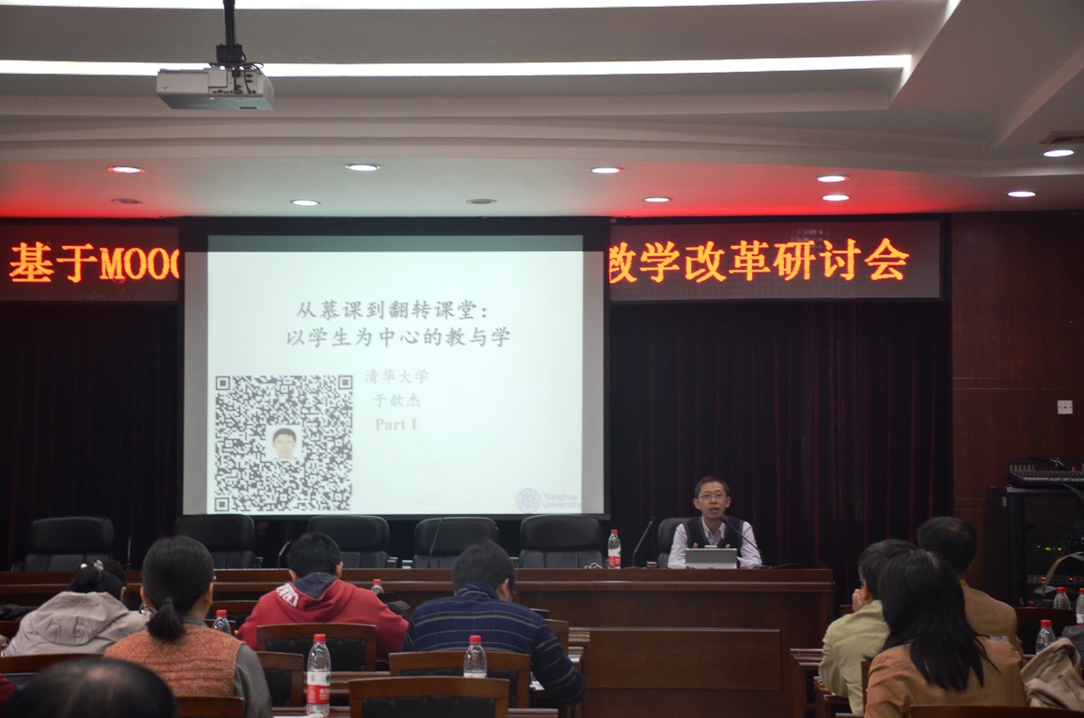 于歆杰作题为《从慕课到翻转课堂:以学生为中心的教与学》的报告。于老师2013年开设清华首门慕课“电路原理”,吸引全球近160个国家的超过13万名学生选修,2014年提出“以学生为中心的教与学”模式,在近20所“985”、“211”、一本、二本院校得以推广应用,相应成果获2016年清华大学教学成果特等奖。他在报告一开始就使用了“雨课堂”这种新颖的课堂互动模式,报告途中随时推送限时问答题。这种互动模式简单方便可以实时使用,深受与会者的喜爱,从慕课的基本情况、清华大学电路原理慕课、慕课的建设、以学生为中心的教与学、慕课对谁有帮助等诸多方面分享了慕课建设的经验和感想。强调在线教育是“以学生为中心的教与学,是教师找到金饭碗的途径!”报告后教师们纷纷抓住机会向于歆杰提问学习,深感机会难得。