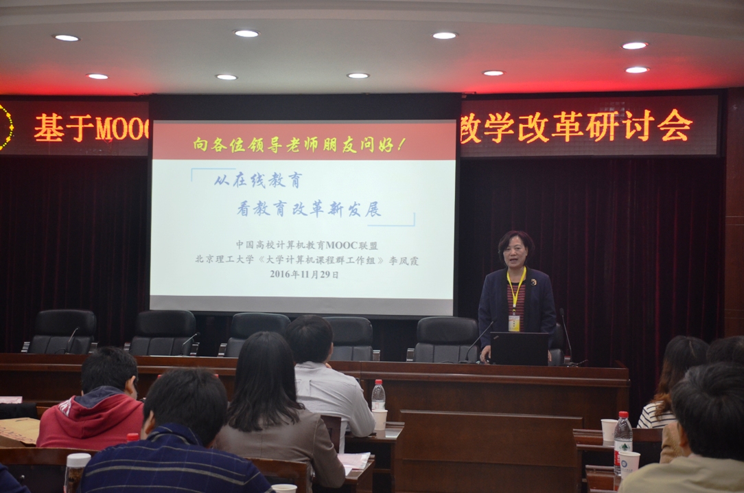 【本网讯】为进一步推进慕课建设和应用,由教育部高等学校计算机类专业教学指导委员会、软件工程专业教学指导委员会、大学计算机课程教学指导委员会和动画、数字媒体专业教学指导委员会联合组建的“中国高校计算机教育MOOC联盟”,在我校设立西南培训中心。培训中心组织的第1期研修班暨基于MOOC+SPOCs的翻转课堂教学改革研讨会于2016年10月29日~30日在我校举办。研讨会邀请了著名MOOC教学专家北京理工大学李凤霞和清华大学于歆杰主讲,来自全国十几所高校的教学骨干共五十余人参加了研讨会。