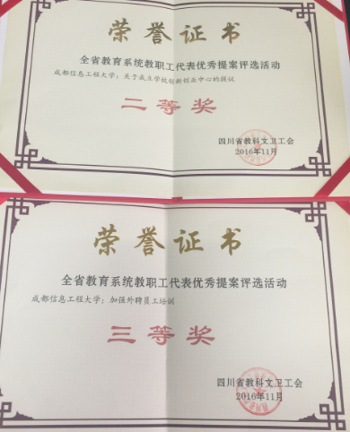 【本网讯】11月16日上午,四川省教科文卫工会第三届委员会第五次全体会议在成都金河宾馆召开。大会宣布了全省教育系统优秀教职工代表提案评选结果。我校推荐的羊裔高代表“关于成立学校创新创业中心”的提案荣获二等奖;巩远发代表的“加强外聘员工培训工作”的提案荣获三等奖。