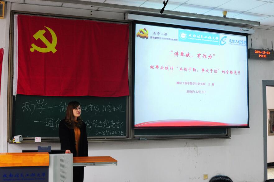 【本网讯】12月3日,通信工程学院学生党支部于1108教室召开专题学习会议,学生党支部书记王燕带领我院全体学生党员,认真学习党的十八届六中全会精神、省委十届九次全会精神,并围绕“两学一做”专题下如何做“讲奉献、有作为”的合格党员进行学习讨论。